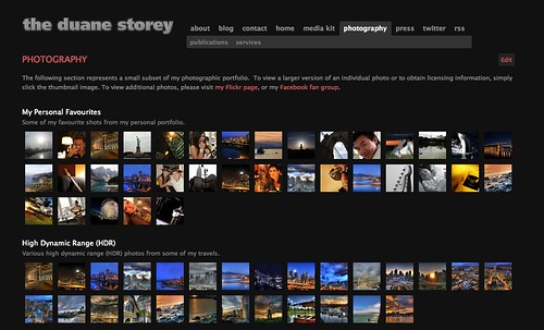 I’m really not sure the best way to integrate Twitter at this point. Given the amount of Tweets I do in a typical day, it’s really not very useful to have them in a list anywhere. I might figure out a way to do something with the Twitter favourite system and have only those Tweets shown somewhere. I’m also probably going to put some type of FriendFeed or LifeStream on my main page, such that it represents a snapshot of everything I’ve been doing. I’d also like to find a way to merge Flickr and SmugMug, such that someone viewing a Flickr photo would be presented with a “Buy Photo” which would redirect them to the same photo on SmugMug. I’m pretty sure I can come up with some clever tagging system to make that work.